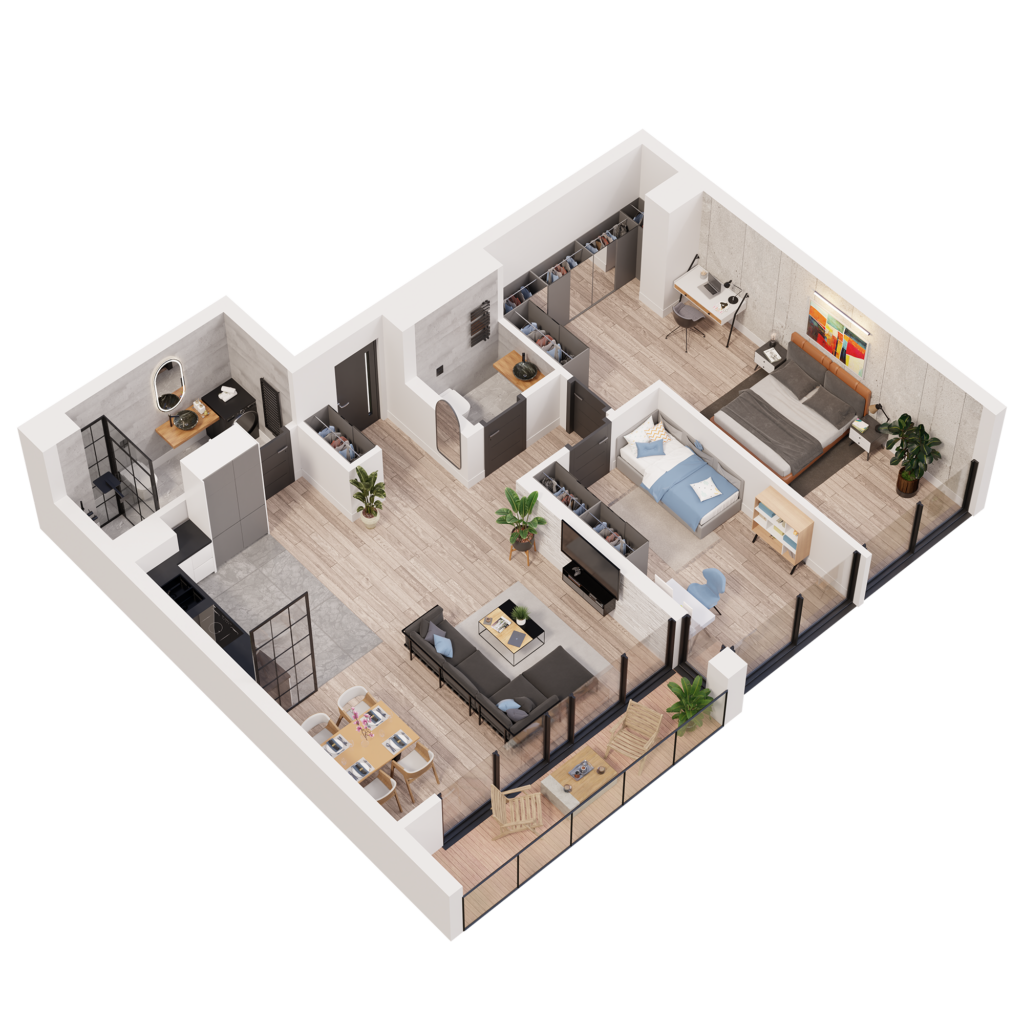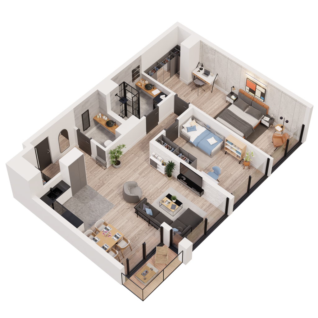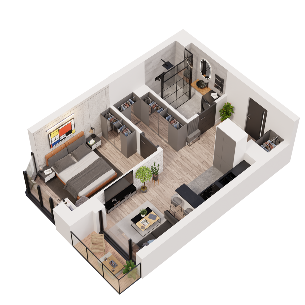 Apartamenty na tym piętrze to synonim luksusu i komfortu. Szklane fasady na całej wysokości pomieszczeń potęgują wrażenie przestrzeni i zapewniają doskonałe doświetlenie wnętrz. Przesuwne drzwi prowadzące na taras lub loggię pozwalają w pełni cieszyć się widokiem i świeżym powietrzem.