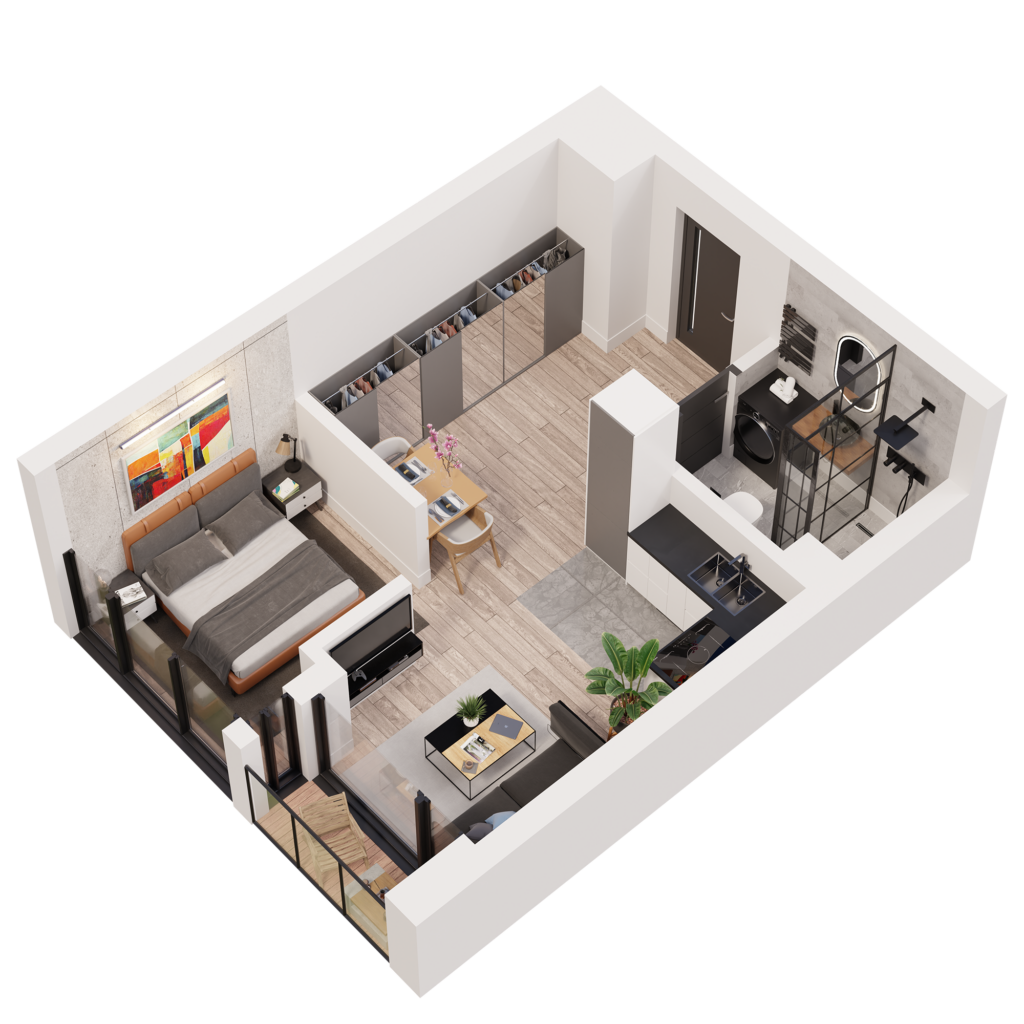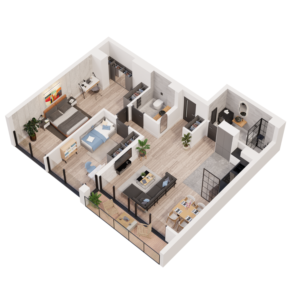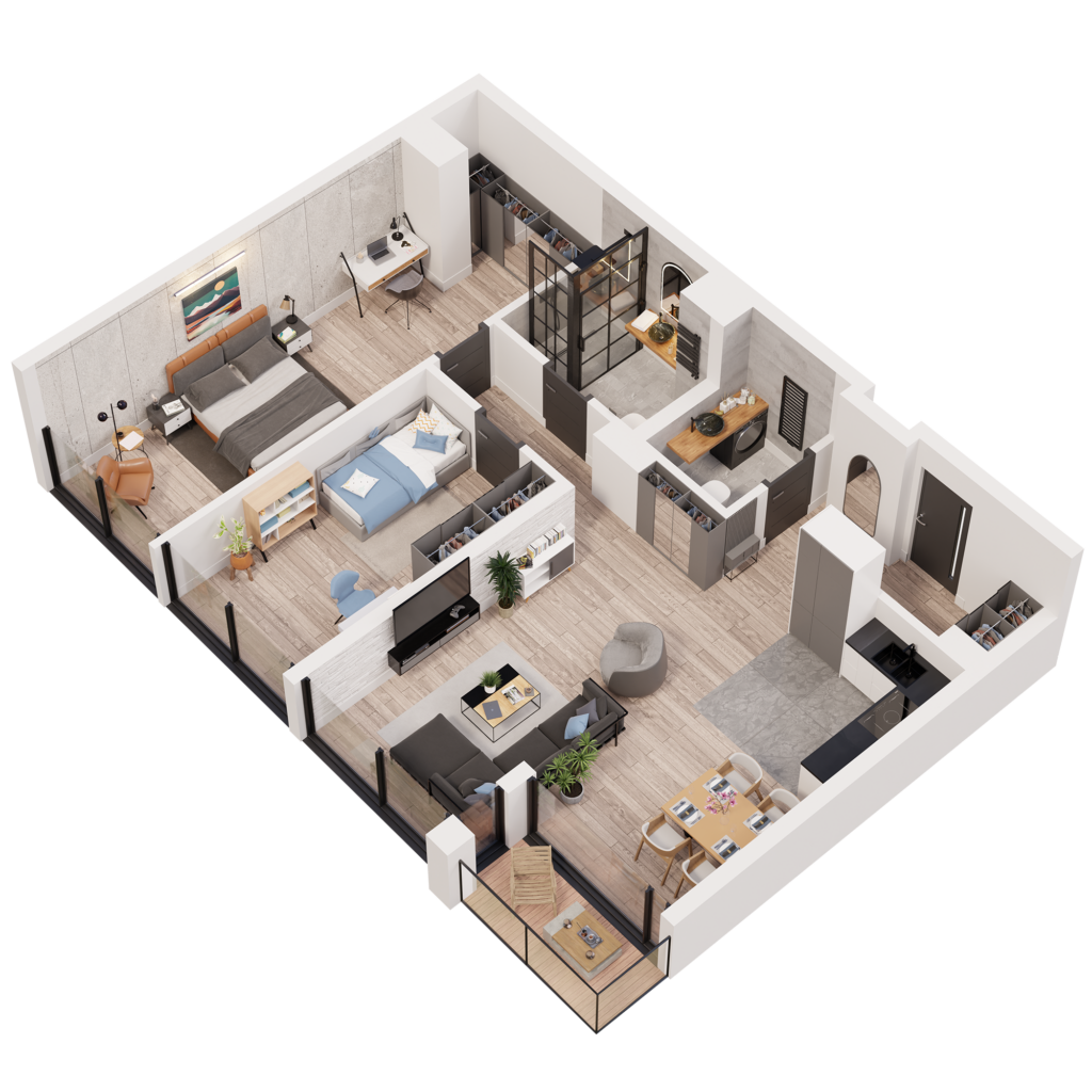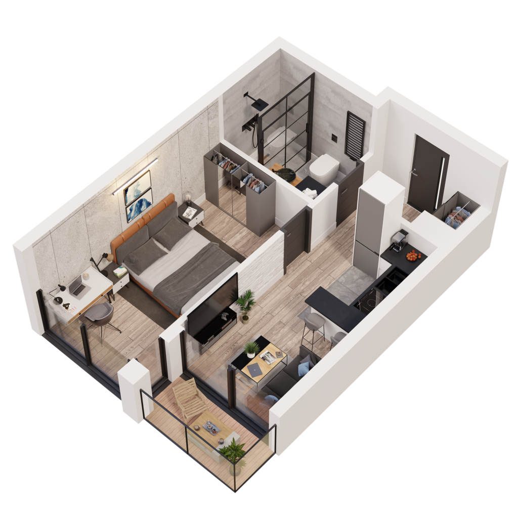 Apartamenty na tym piętrze to synonim luksusu i komfortu. Szklane fasady na całej wysokości pomieszczeń potęgują wrażenie przestrzeni i zapewniają doskonałe doświetlenie wnętrz. Przesuwne drzwi prowadzące na taras lub loggię pozwalają w pełni cieszyć się widokiem i świeżym powietrzem.